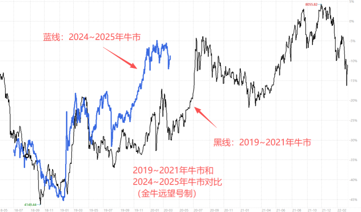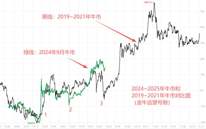 黑线是2019~2021年牛市,绿线是2024年~2025年本轮牛市。二者做了底部对齐。